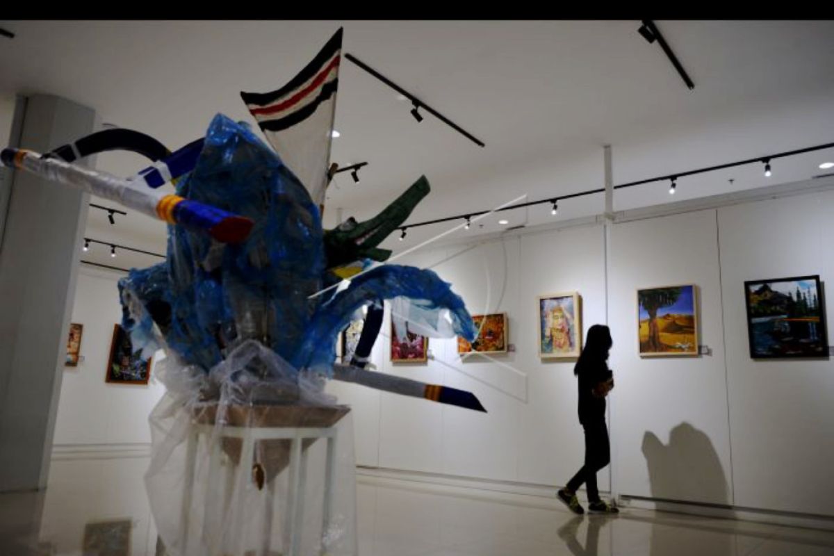 Pengunjung mengamati karya seni rupa yang dipajang dalam pameran bertajuk Tera Rupa di Denpasar, Bali, Rabu (22/9/2021). Pameran tersebut menampilkan 91 karya seni rupa berbagai jenis seperti patung, instalasi dan lukisan karya mahasiswa jurusan Seni Murni Institut Seni Indonesia (ISI) Denpasar untuk membangkitkan semangat berkreativitas dan apresiasi karya mahasiswa di masa pandemi COVID-19. ANTARA FOTO/Fikri Yusuf/nym.