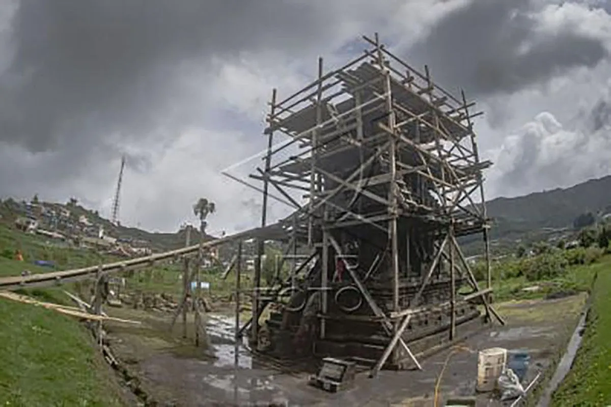 Pekerja menyelesaikan pemugaran Candi Setyaki di Dataran Tinggi Dieng, Batur, Kabupaten Banjarnegara, Jawa Tengah, Selasa (23/11/2021). Pemugaran candi bercorak Hindu yang diperkirakan dibangun pada abad 8-9 Masehi tersebut dilakukan untuk melengkapi bagian atap candi yang sebelumnya hanya tampak kaki dan tubuh, serta memperbaiki sebagian titik candi yang rusak. ANTARA FOTO/Aditya Pradana Putra/nym.