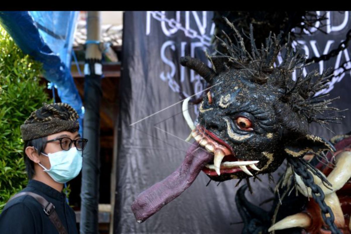 Warga mengamati Ogoh-ogoh berjudul Gerubug karya kelompok pemuda ST. Tunas Muda di Sidakarya, Denpasar, Bali, Minggu (27/2/2022). Ogoh-ogoh yang akan diarak pada malam pengrupukan atau sehari sebelum Hari Raya Nyepi yang terbuat dari bahan-bahan ramah lingkungan serta masker untuk menggambarkan kondisi kehidupan sosial, budaya dan ekonomi masyarakat selama masa pandemi COVID-19. ANTARA FOTO/Fikri Yusuf/nym.