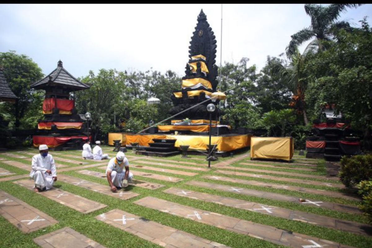 Umat Hindu membuat pedoman jaga jarak untuk pelaksanaan upacara Tawur Agung di Pura Parahyangan Jagat Guru, Serpong, Tangerang Selatan, Banten, Senin (28/2/2022). Tawur Agung merupakan upacara yang dilakukan umat Hindu dalam rangka menyambut Hari Raya Nyepi tahun baru Saka 1944. ANTARA FOTO/Muhammad Iqbal/nym.