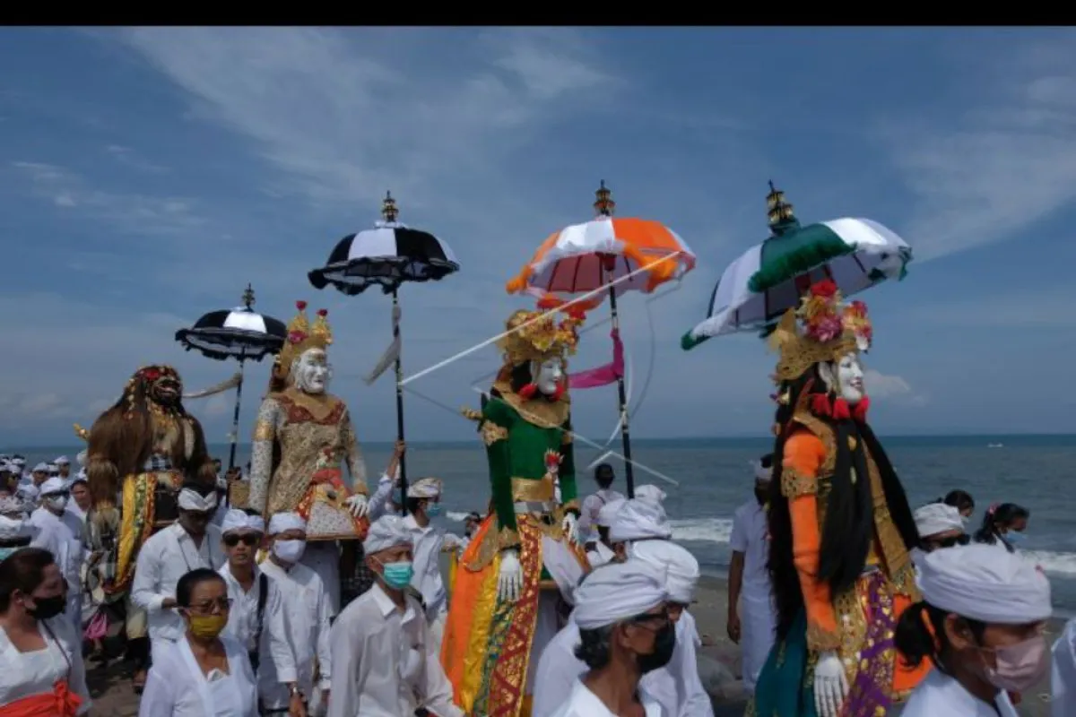 Umat Hindu membawa benda-benda sakral saat mengikuti upacara Melasti jelang Hari Raya Nyepi Tahun Baru Saka 1944 di Pantai Padang Galak, Denpasar, Bali, Senin (28/2/2022). Upacara yang serentak dilaksanakan umat Hindu se-Bali tersebut untuk menyucikan diri secara lahir dan batin dalam menyambut Hari Raya Nyepi Tahun Saka 1944 pada 3 Maret 2022 mendatang dengan tetap menerapkan protokol kesehatan dan membatasi jumlah umat guna mencegah penyebaran COVID-19. ANTARA FOTO/Nyoman Hendra Wibowo/nym.