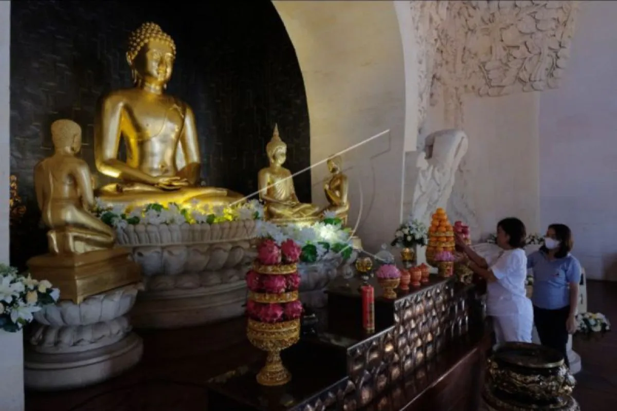 Umat Buddha meletakkan buah-buahan di altar persembahyangan saat persiapan menyambut Hari Raya Waisak 2566 BE/2022 di Vihara Buddha Sakyamuni, Denpasar, Bali, Minggu (15/5/2022). Umat Buddha di vihara tersebut melakukan kerja bakti menjelang persembahyangan Hari Raya Tri Suci Waisak 2566 BE yang digelar pada Senin 16 Mei 2022. ANTARA FOTO/Nyoman Hendra Wibowo/nym.