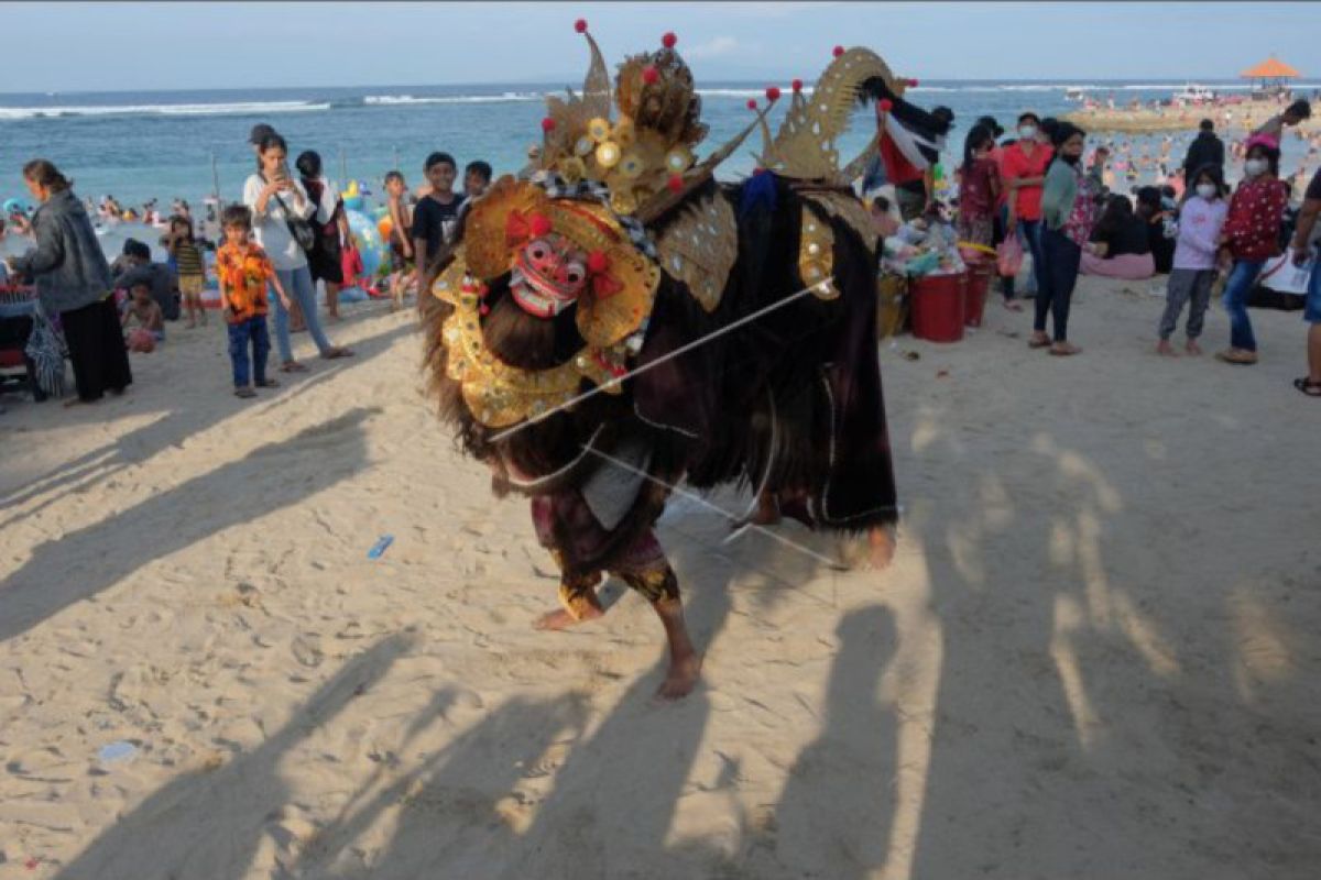 Umat Hindu membawakan tarian Barong dalam tradisi Ngelawang di Pantai Sanur, Denpasar, Bali, Kamis (9/6/2022). Tradisi yang digelar di objek wisata tersebut merupakan rangkaian Hari Raya Galungan sebagai ritual tolak bala untuk menetralisir aura negatif dan sekaligus mempromosikan pariwisata Bali. ANTARA FOTO/Nyoman Hendra Wibowo/nym.