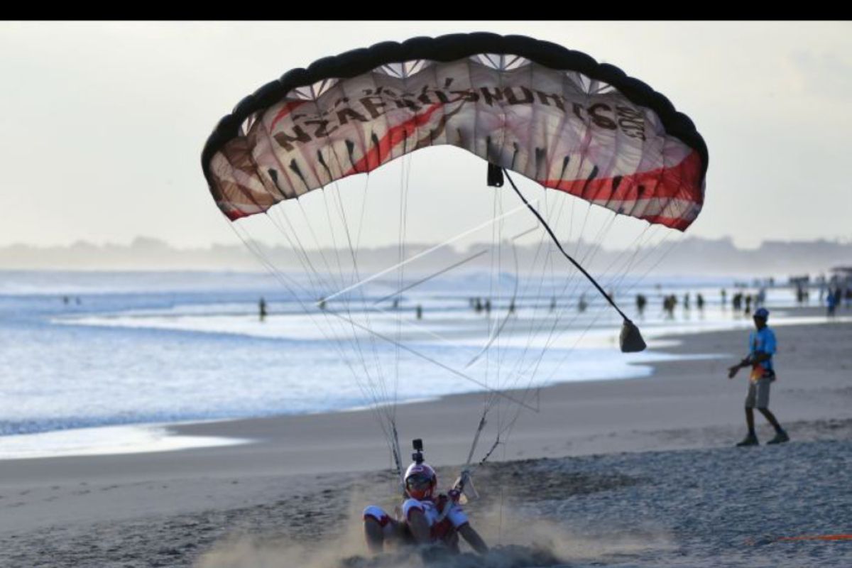 Juara dunia skydiving asal Prancis Greg Crozier melakukan pendaratan pada hari pertama pelaksanaan Bali International Boogie 2022 di Pantai Mesari, Seminyak, Badung, Bali, Selasa (21/6/2022). Kegiatan terjun payung (skydiving) non-kompetisi berskala internasional bertajuk "Jump in Paradise" itu diikuti oleh puluhan penerjun payung dengan kualifikasi minimal intermediate hingga profesional dari berbagai negara seperti Prancis, Mesir, Rusia, Ukraina, Amerika Serikat dan Indonesia. ANTARA FOTO/Fikri Yusuf/nym.