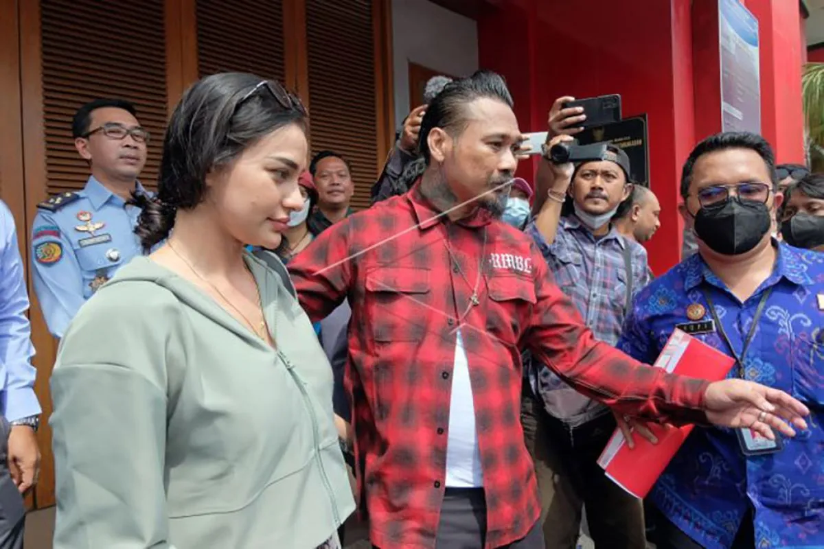Terpidana I Gede Ari Astina alias Jerinx (tengah) didampingi istrinya Nora Alexandra (kiri) berjalan usai bebas dari penjara di Lapas Permasyarakatan Kelas II A Kerobokan, Badung, Bali, Selasa (2/8/2022). Ditjen Pemasyarakatan Kementerian Hukum dan HAM mengabulkan permohonan cuti bersyarat yang diajukan penabuh drum grup musik Superman is Dead (SID) tersebut hingga 1 Desember 2022 dengan menjalani program pembinaan Balai Pemasyarakatan Kelas I Denpasar. ANTARA FOTO/Nyoman Hendra Wibowo/nym.