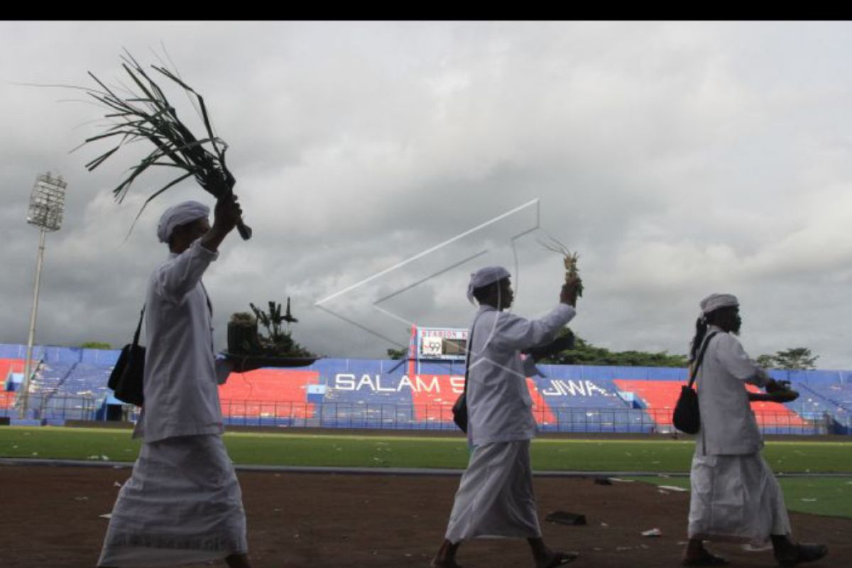 Sejumlah umat Hindu melakukan tradisi ritual Pangruwating Bumi Kanjuruhan di Stadion Kanjuruhan, Malang, Jawa Timur, Jumat (7/10/2022). Tradisi ritual tersebut dilakukan untuk mendoakan para korban tragedi Kanjuruhan serta memohon kepada Tuhan agar kejadian tersebut tidak terulang kembali. ANTARA FOTO/Ari Bowo Sucipto/nym.