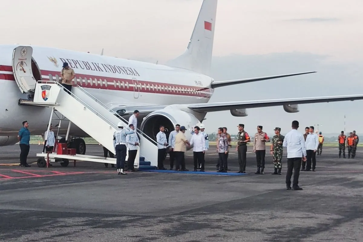 Pesawat Kepresidenan berseri PK-GRD yang membawa Presiden Prabowo dan rombongan tiba di Lanud Adi Soemarmo sekitar pukul 17.30 WIB.