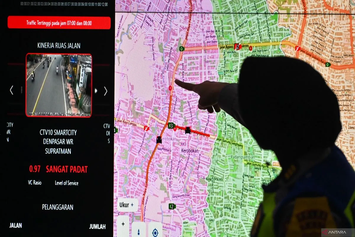 Petugas memantau informasi kondisi lalu lintas di ruang program Smart City Bali berbasis Road Safety Policing, Polda Bali, Denpasar, Bali, Rabu (17/12/2025). Fasilitas yang terhubung dengan Command Center Road Safety dan didukung dengan 236 CCTV terintegrasi untuk pengelolaan keamanan serta lalu lintas secara real time tersebut menjadi pusat komando dalam menjaga keamanan, keselamatan, ketertiban, dan kelancaran lalu lintas di Bali khususnya selama pelaksanaan Operasi Natal 2025 dan Tahun Baru 2026. ANTARA FOTO/Fikri Yusuf/rwa.