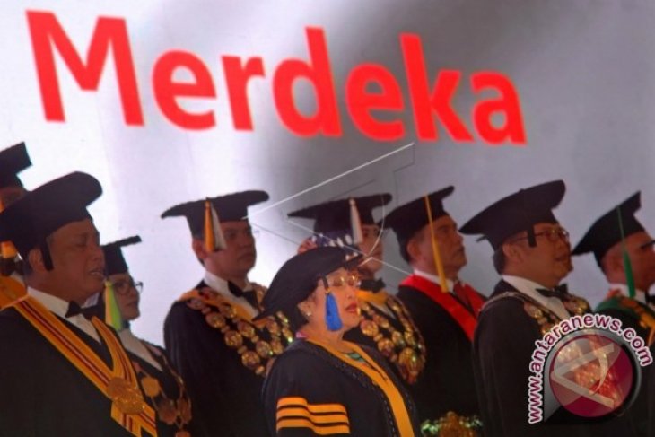 Chairperson of the PDIP Megawati Soekarnoputri (center) sing Indonesia Raya when he joined the procession awarding of Honorary Doctorate Degree of Politics and Government at Unpad Campus, West Java. (ANTARA FOTO/Fahrul Jayadiputra/wdy/16)