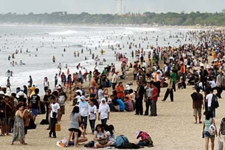 Kuta (Antara Bali) - Ribuan wisatawan memadati Pantai Kuta saat liburan Hari Raya Natal, Jumat (25/12). Obyek wisata di Bali pada libur Hari Raya Natal 2009 padat pengunjung dan Pantai Kuta menjadi salah satu lokasi yang paling digemari para wisatawan. FOTO ANTARA/Nyoman Budhiana/09.
