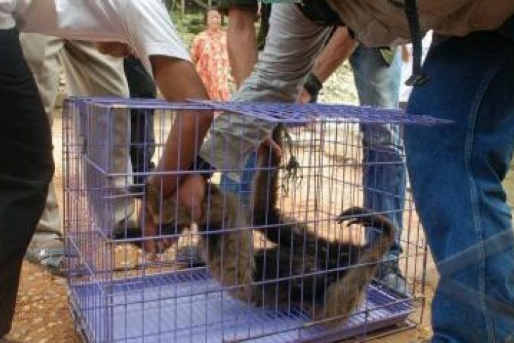 Muara Teweh (Antara Bali) - Sejumlah petugas dari Yayasan Kalaweit memasukan Owa-owa (Hylobates Mulleri) ke dalam kurungan untuk dibawa ke pusat rehabilitasi di kawasan Dusun Pararawen Desa Lemo, Kabupaten Barito Utara, Kalimantan Tengah, Sabtu (26/1). Primata betina berusia sekitar lima tahun itu diserahkan warga setempat untuk dilepasliarkan ke habitatnya yang sebelumnya direhabilitasi melalaui yayasan tersebut. FOTO ANTARA/Kasriadi/nym/2013.