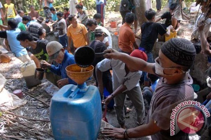 Warga mengambil bahan bakar minyak (BBM) di sekitar jalur pipa milik Pertamina yang bocor di Desa Pasir Batang, Manonjaya, Tasikmalaya, Jabar, Selasa (30/7). Meskipun dilarang oleh pihak Kepolisian dan Pertamina, namun warga masih tetap mengambil bensin yang tersisa. ANTARA FOTO/Adeng Bustomi/nym/2013.