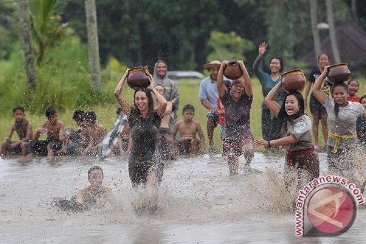 Seorang wisatawan turut serta dalam lomba lari di lumpur sambil menjunjung kendi pada Festival Air di Desa Suwat, Gianyar, Senin (2/1). Kegiatan selama lima hari tersebut untuk pelestarian seni dan budaya, menggali potensi desa wisata sekaligus untuk merayakan Tahun BAru 2017. ANTARA FOTO/Nyoman Budhiana/i018/2017.