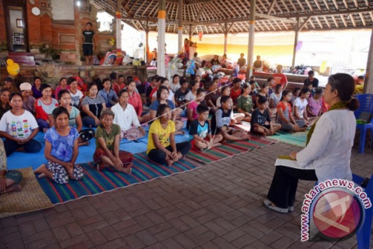 Relawan memberikan pelatihan yoga kepada warga pengungsi erupsi Gunung Agung di Desa Tenganan Pegeringsingan, Karangasem, Bali, Rabu (27/9). Terapi yoga tersebut diberikan secara bergantian di setiap posko pengungsi Gunung Agung untuk menghilangkan depresi dan stres sehingga para pengungsi bisa tabah dalam menghadapi bencana alam tersebut. ANTARA FOTO/Wira Suryantala/wdy/2017.