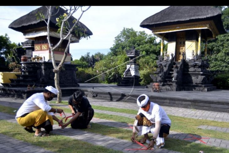 Umat Hindu memasang tanda pengaturan jarak di Pura Dalem Penataran, Desa Adat Legian, Badung, Bali, Senin (14/9/2020). Pemasangan tanda tersebut dilakukan untuk mengatur jarak dan membatasi jumlah umat yang bersembahyang dalam waktu bersamaan saat Hari Raya Galungan pada Rabu (16/9) mendatang sebagai penerapan protokol kesehatan guna mencegah penyebaran pandemi COVID-19 yang terus meningkat di Bali. ANTARA FOTO/Fikri Yusuf/nym
