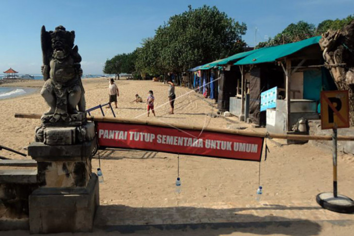 Spanduk penutupan terpasang pada pintu masuk obyek wisata saat Pemberlakuan Pembatasan Kegiatan Masyarakat (PPKM) Level 4 di Pantai Sanur, Denpasar, Bali, Kamis (26/8/2021). Berdasarkan data secara kumulatif Satgas Penanganan COVID-19 Kota Denpasar dari tanggal 1 - 25 Agustus 2021 terkonfirmasi kasus positif COVID-19 berjumlah 8.879 orang, angka kesembuhan 11.781 orang, meninggal dunia 285 orang dan kasus aktif yang masih dalam perawatan sebanyak 2.447 orang. ANTARA FOTO/Nyoman Hendra Wibowo/nym.