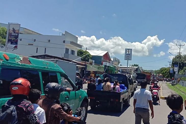 Suasana kemacetan lalu lintas saat warga hendak mengungsi ke tempat yang lebih aman menyusul adanya peringatan dini tsunami di Kota Maumere, Kabupaten Sikka, NTT, Selasa (14/12/2021). Gempa berkekuatan 7,4 skala richter pada pukul 11.20 Wita di Laut Flores tersebut disusul adanya peringatan dini tsunami dari BMKG sehingga mengakibatkan warga di Kota Maumere berhamburan mengungsi karena trauma dengan tsunami yang pernah terjadi pada tahun 1992. ANTARA FOTO/Siska/nym.