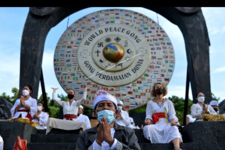 Sejumlah warga mengikuti kegiatan doa untuk perdamaian dunia di Gong Perdamaian Dunia, Kertalangu, Denpasar Senin (14/3/2022). Kegiatan doa bersama lintas agama tersebut dilakukan untuk memohon terciptanya perdamaian di dunia serta mendoakan agar operasi militer Rusia terhadap Ukraina dapat segera dihentikan. ANTARA FOTO/Fikri Yusuf/nym.