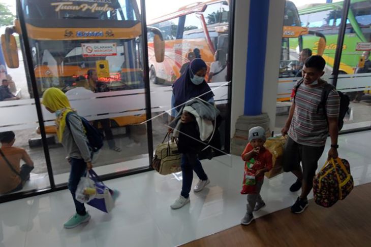 Pemudik bersiap-siap memasuki bus antar kota antar provinsi (AKAP) saat arus mudik Idul Fitri 1443 Hijriah di Terminal Mengwi, Badung, Bali, Rabu (27/4/2022). Pengelola terminal mempersiapkan 127 unit armada bus untuk membantu memperlancar perjalanan pemudik ke Pulau Jawa pada arus mudik Idul Fitri 1443 Hijriah serta mengantisipasi terjadinya lonjakan penumpang pada 28-29 April 2022. ANTARA FOTO/Nyoman Hendra Wibowo/nym.