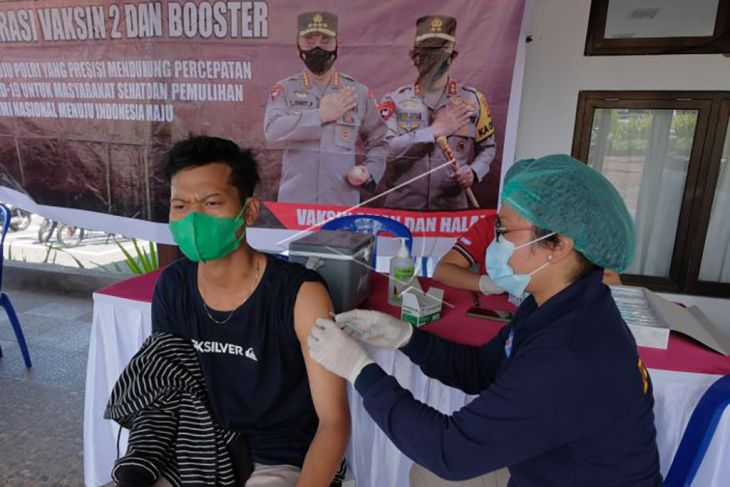 Petugas kesehatan menyuntikkan vaksin dosis ketiga kepada seorang wisatawan saat vaksinasi booster di kawasan objek wisata Tanah Lot, Tabanan, Bali, Rabu (4/5/2022). Kegiatan yang digelar di kawasan objek wisata tersebut sebagai upaya mendukung percepatan penanganan COVID-19 untuk masyarakat sehat guna membangkitkan pariwisata dan pemulihan ekonomi menyusul pencapaian vaksinasi booster di Bali sudah mencapai 61,89 persen. ANTARA FOTO/Nyoman Hendra Wibowo/nym.