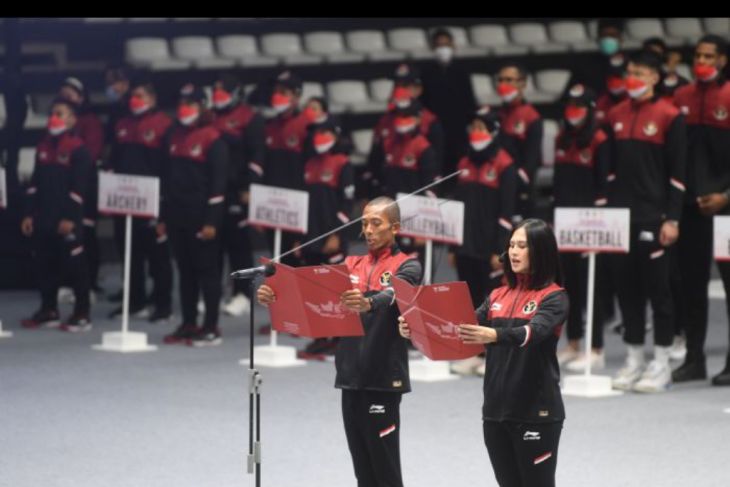 Pelari Agus Prayogo (kiri) dan Karateka Ceyco Georgia Zefanya (kanan) membacakan sumpah atlet saat upacara pengukuhan kontingen tim Indonesia untuk Sea Games Vietnam di Jakarta, Minggu (8/5/2022). Tim Indonesia akan memberangkatkan 476 atlet untuk mengikuti 31 cabang olahraga. ANTARA FOTO/Akbar Nugroho Gumay/nym.