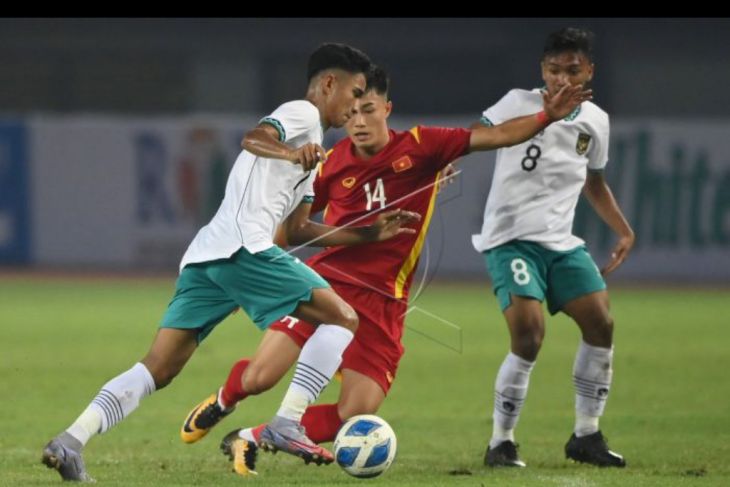 Pesepak bola Tim Nasional Indonesia U-19 Marselino Ferdinan (kiri) berebut bola dengan pesepak bola Tim Nasional Vietnam U-19 Nguyen Van Truong (tengah) dalam laga penyisihan Grup A Piala AFF U-19 2022 di Stadion Patriot Candrabhaga, Bekasi, Jawa Barat, Sabtu (2/7/2022). Pertandingan berakhir imbang tanpa gol. ANTARA FOTO/Aditya Pradana Putra/nym.