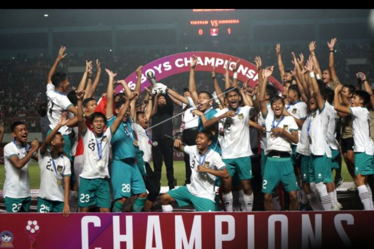 Pemain Timnas Indonesia U-16 merayakan kemenangan seusai mengalahkan Timnas Vietnam U-16 saat laga final AFF U-16 2022 di Stadion Maguwoharjo, Depok, Sleman, D.I Yogyakarta, Jumat (12/8/2022). Timnas Indonesia U-16 berhasil menjadi menjuarai Piala AFF U-16 setelah mengalahkan Timnas Vietnam U-16 dengan skor 1-0. ANTARA FOTO/Andreas Fitri Atmoko/nym.