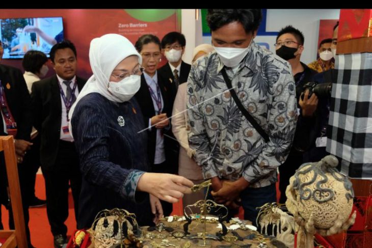 Menteri Ketenagakerjaan Ida Fauziyah (kiri) mengamati produk kerajinan saat membuka Showcasing of Indonesian G20 Presidency Exhibition yang merupakan rangkaian dari acara G20 Labour and Employment Ministers Meeting (LEMM) di Jimbaran, Badung, Bali, Senin (12/9/2022). Kementerian Ketenagakerjaan menggelar acara G20 LEMM yakni pertemuan para menteri ketenagakerjaan Anggota G20 pada 13-14 September 2022 dengan mengangkat tema 'Improving the Employment Condition to Recover Together atau Meningkatkan Kondisi Kerja untuk Pulih Bersama'. ANTARA FOTO/Nyoman Hendra Wibowo/nym.