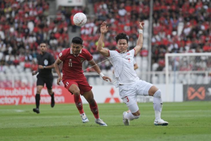 Pesepak bola Timnas Indonesia Dendy Sulistyawan (kiri) berebut bola dengan pesepak bola Timnas Vietnam Que Ngoc Hai (kanan) dalam pertandingan leg 1 babak semifinal Piala AFF 2022 di Stadion Utama Gelora Bung Karno (SUGBK), Jakarta, Jumat (6/1/2023). Indonesia ditahan imbang Vietnam dengan skor 0-0. ANTARA FOTO/Akbar Nugroho Gumay/nym.