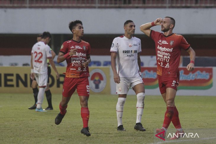 Pesepak Bola Bali United FC Spasojevic (kanan) berselebrasi usai menjebol gawang Persis Solo dalam pertandingan BRI Liga 1 di Stadion Maguwoharjo, Sleman, D.I Yogyakarta, Senin (27/2/2023). Bali United FC tekuk Persis Solo 3-1. ANTARA FOTO/Andreas Fitri Atmoko/wsj.