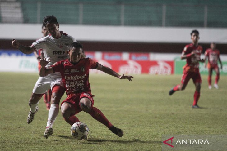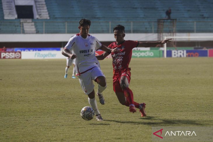 Pesepak Bola Bali United FC Ricky Fajrin (kedua kiri) berebut bola dengan pesepak bola Persis Solo Irfan Bachdim (kiri) dalam pertandingan BRI Liga 1 di Stadion Maguwoharjo, Sleman, D.I Yogyakarta, Senin (27/2/2023). Bali United FC tekuk Persis Solo 3-1. ANTARA FOTO/Andreas Fitri Atmoko/wsj.