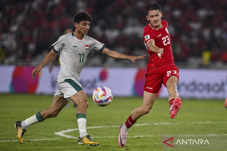 Pesepak bola Tim Nasional Indonesia Marselino Ferdinan (bawah) berusaha menghalau bola tendangan bebas saat melawan Tim Nasional Irak dalam laga lanjutan Grup F Kualifikasi Piala Dunia 2026 zona Asia, di Stadion Utama Gelora Bung Karno (SUGBK), Senayan, Jakarta, Kamis (6/6/2024). Timnas Indonesia kalah dengan skor 0-2. ANTARA FOTO/Galih Pradipta/wsj.