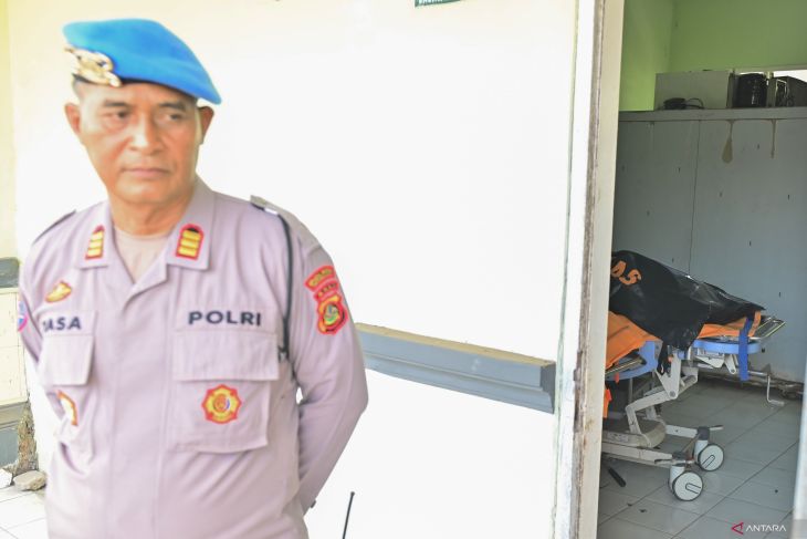 Polisi berjaga di dekat kantong jenazah korban tenggelamnya KMP Tunu Pratama Jaya di ruang jenazah RSU Negara, Jembrana, Bali, Kamis (3/7/2025). Hingga Kamis (3/7) petang, tim SAR gabungan telah berhasil mengevakuasi enam orang korban meninggal dunia dan 29 orang korban selamat yang merupakan penumpang kapal yang tenggelam di Selat Bali setelah berlayar dari Pelabuhan Ketapang menuju Pelabuhan Gilimanuk. ANTARA FOTO/Fikri Yusuf/wsj.